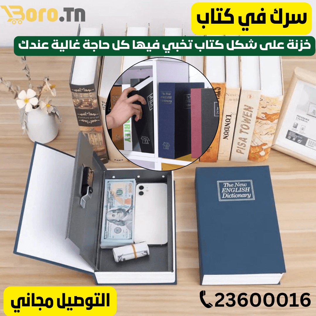 صندوق الكتاب مصنوع من معدن متين مع غلاف يشبه الكتاب، مما يجعله مقاومًا للاستخدام اليومي ويحمي محتوياته من التلف أو التضرر
